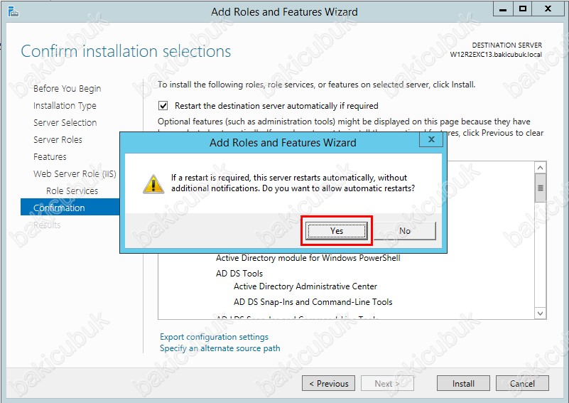 Application Server ve Web Server (IIS ) rolü ile birlikte Features ( Özellik ) kurulumu tamamlandiktan sonra sunucumun otomatik olarak restart için Restart the destination server automatically if required seçeneğini işaretliyorum karşıma gelen uyariya Yes diyoruz.