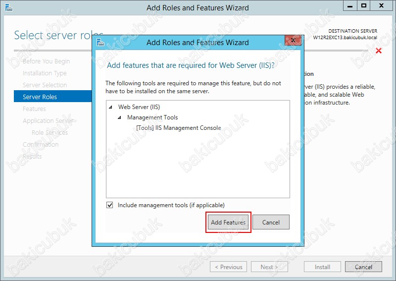 Web Server (IIS) rolünü seçtiğimizde Add Roles and Features Wizard ekrani geliyor karşımıza Web Server (IIS) rolü ile birlikte Web Server (IIS) rolü içinde bulunan Management Tools altinda bulunan IIS Management Tools özelliğinin kurulması gerektiğini belirtiyor bizlere kurulumu devam etmek için Add Required Features diyerek bu özelliğinde kurulmasi sağlıyoruz.