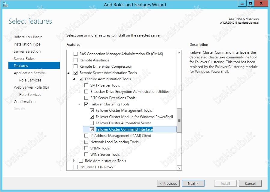 Remote Server Administration Tools altinda bulunan Features Administration Tools altindaki Failover Clustering Tools altindaki Failover Cluster Management Tools,Failover Cluster Modele for Windows PowerShell ve Failover Cluster Command Interface seçiyoruz.