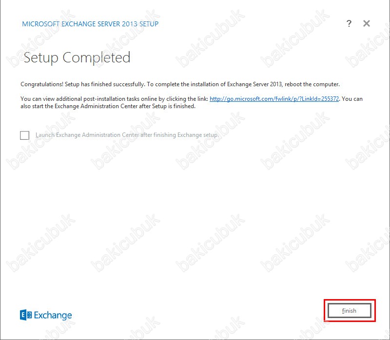 Exchange Server 2013 kurulumu başarılı bir şekilde tamamlaniyor. Sunucumuzu restart etmek için Finish diyoruz ve sunucumuzu restart ediyoruz.