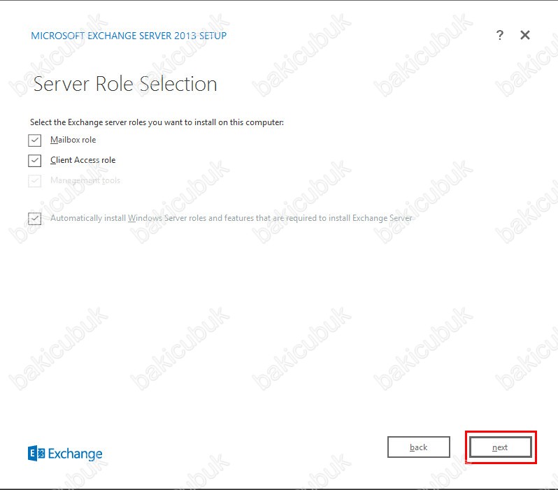En altta bulunan Automatically install Windows Server roles and features that are required to install Exchange Server seçeneği Exchange Server 2013 çalışması için gereki olan servislerin rollerin ve özelliklerin kurulu yapılmadıysa kurulum sirasinda yükleminizi otomatik olarak sağlamaktadır.
