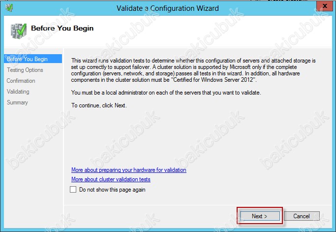 Confirmation ekraninda Failover Cluster yapımız için sunucular üzerinde yapılacak olan bütün testlerin bir listesini veriyor bizlere testi başlatmak için Next diyoruz.