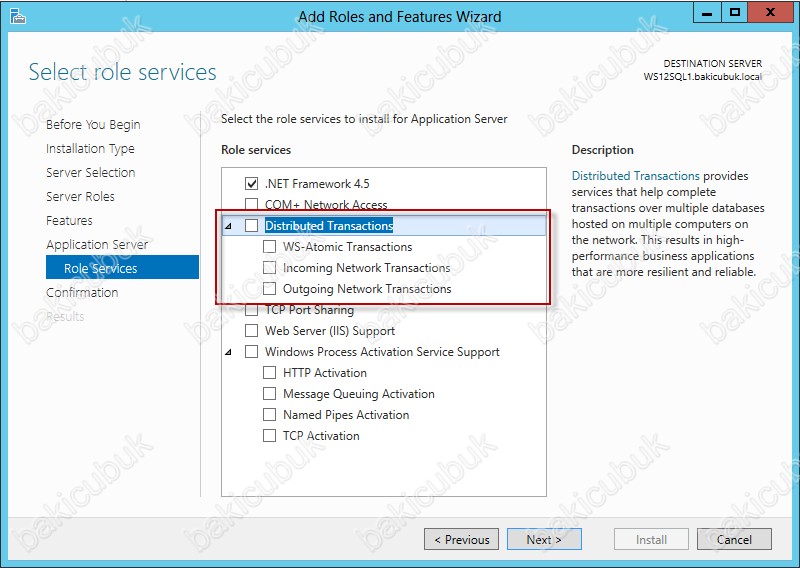 Select role services ekraninda SQL Server Cluster olarak yapılandırılacak sunucularda Application Server rolü içerisindeki .Net Framework 4.5,Incoming Network Transactions,Outgoing Network Transactions servislerini seçiyoruz.