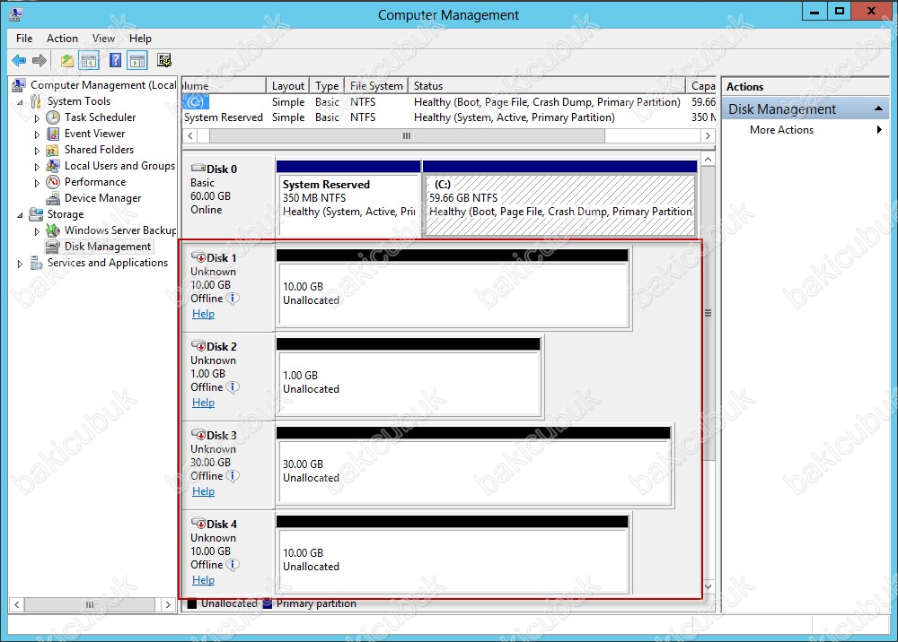 Disk Management ekraninda gördüğünüz gibi disklerimiz Offline ve Unknown olarak görülmektedir.