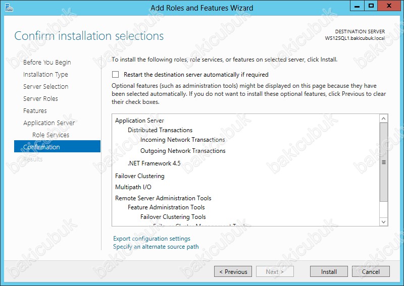 Application Server rolü ve Failover Clustering ve Multipatch I/O özelliklerinin kurulumu tamamlandiktan sonra sunucunun otomatik olarak restart etmek istersek eğer Restart the destination server automatically if required seçeneğini işaretlememiz gerekiyor.