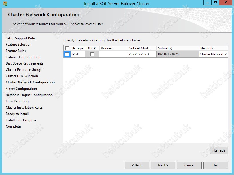 Cluster Network Configuration ekraninda SQL Server 2012 Failover Cluster için yapılandıracağımız IP adresimizi yapılandiriyoruz.