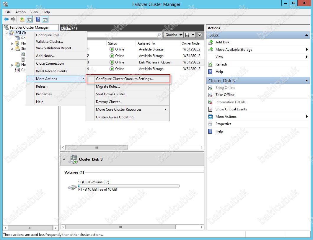 Failover Cluster Manager konsolunda SQLCluster root üzerinde sağ tuş diyerek More Actions menüsü altinda bulunan Configure Cluster Quorum Settings tıklayoruz.