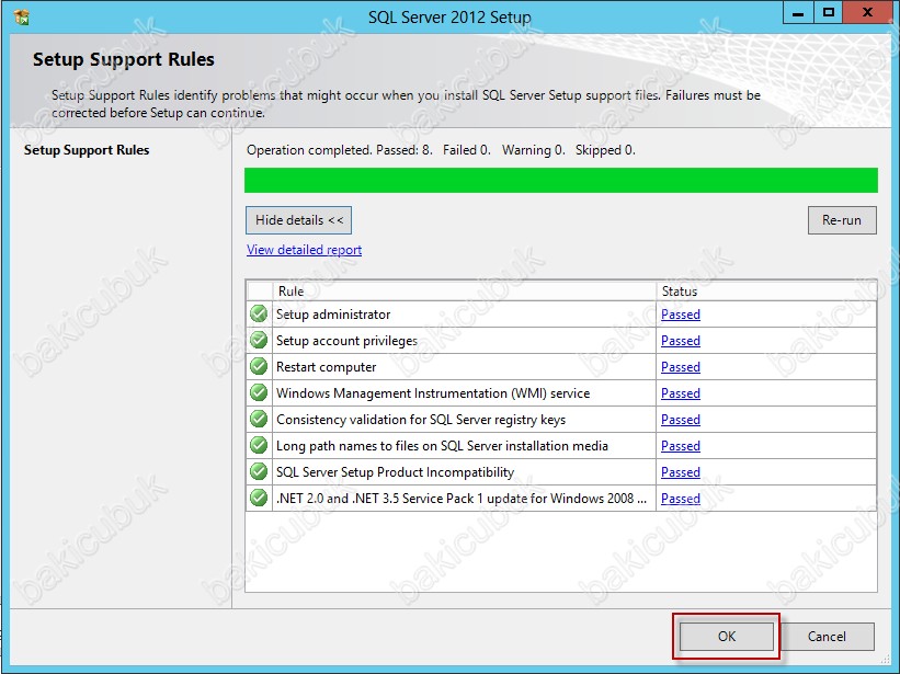 Setup Support Rules ekraninda SQL Server 2012 Failover Cluster yapımızın kurulumuna başlamadan sistemimizdeki SQL Server 2012 kurulumu için herhangi bir eksik ya da hata olup olmadiğini kontrolü gerçekleştiriyor. Herhangi bir eksik ya da hata yoksa kuruluma Next diyerek devam edebiliriz.