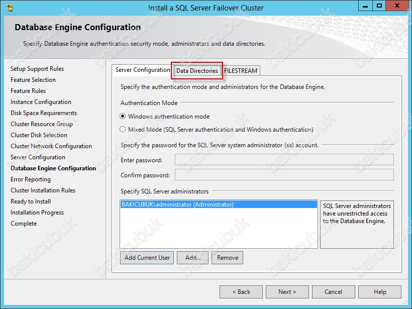 Data Directories sekmesinde Default olarak gelen dizinler değiştirmemiz gerekiyor çünkü biz SQL Server 2012 üzerinde Failover Cluster yapısı kuracağımız için Database,Temp ve Log dosyalarinin Cluster Disklerim üzerinde tutulmasi gerekiyor.