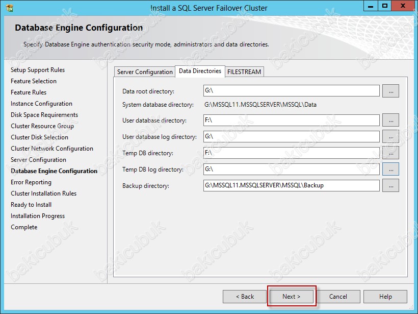 Data Directories sekmesinde Database,Temp ve Log dosyalarini Cluster Disklerimi gösterek yapılandırıyorum ve Next diyerek devam ediyoruz.