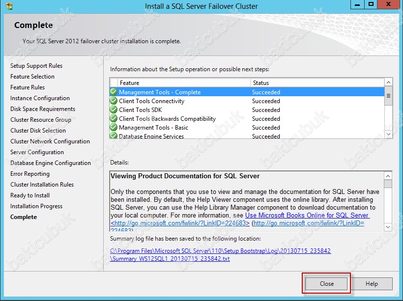 Complete ekraninda SQL Server 2012 Failover Cluster yapımızın başarili bir şekilde kurulduğunu görüyoruz. Close diyerek Wizard ekranini kapatiyoruz.