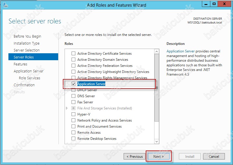 Select server roles ekraninda Application Server rolünün kurulumunu gerçekleştireceğimiz için Application Server rolünü işaretliyoruz.