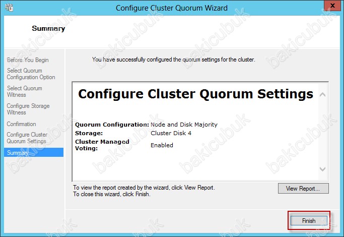 Summary ekraninda Cluster Disk 4 başarılı bir şekilde Quorum diski olarak yapılandırıldığını görebilirsiniz.