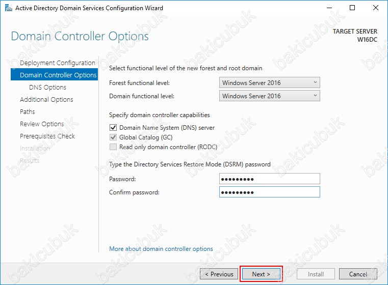 Domain Controller Options ekranın da Specify domain controller capabilities bölümünde herhangi bir değişiklik yapmadan Type the Directory Services Restore Mode (DSRM) password kısmına Active Directory Restore Mode için kullanacağımız Complex Password yazıyoruz. Next diyerek devam ediyoruz.