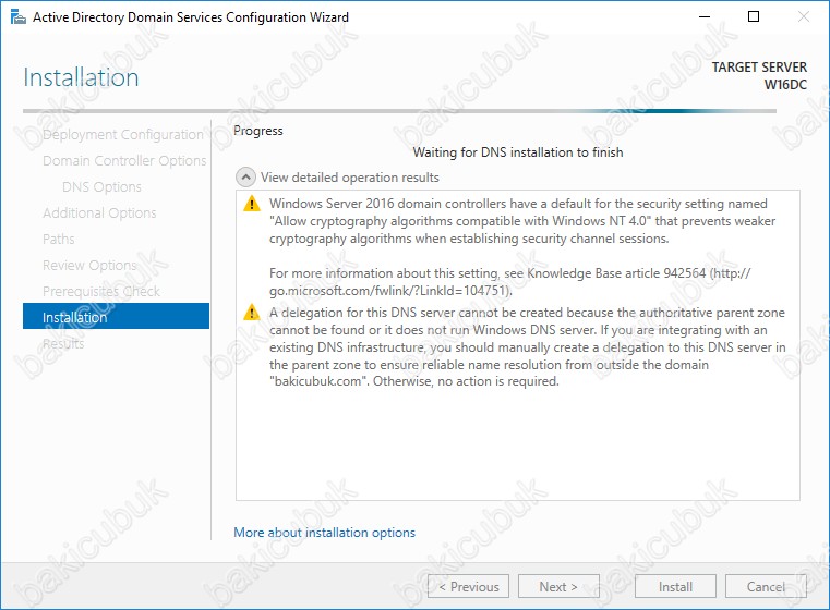 Prerequisities Check ekranın da Windows Server 2016 Active Directory Domain Services rolü için check yaparak herhangi bir problem ya da eksiklik olup olmadiği kontrolünü yapacaktir.