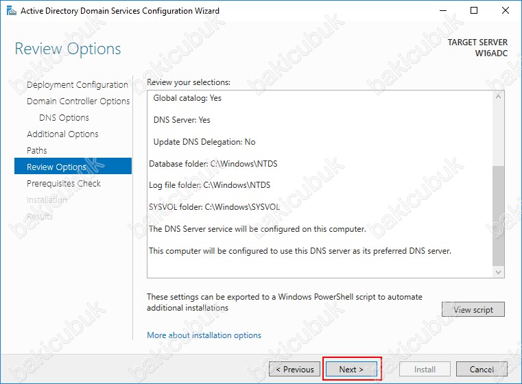 Review Options ekranın da Active Directory Domain Services rolü kurulumu ve Additional Domain Controller yapılandırması için Next diyerek devam ediyoruz.
