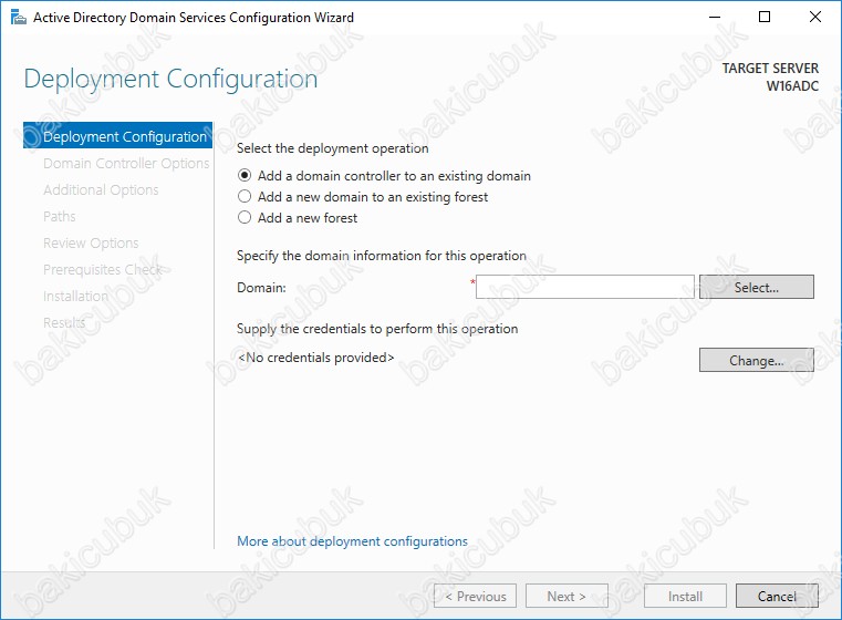 Biz mevcut ortamımızda bakicubuk.local domain yapısın da Additional Domain Controller yapılandıracağımız W16ADC isimli sunumuzu Active Directory Domain yapısına dahil etmediğimiz için Specify the domain information for this operation altında bulunan Domain bölümünü boş olarak geldiğini görüyoruz.