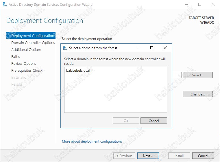 Deployment Configuration ekranın da Specify the domain information for this operation altında bulunan Domain bölümün de Select diyerek bakicubuk.local Active Directory Domain yapısını seçiyoruz.