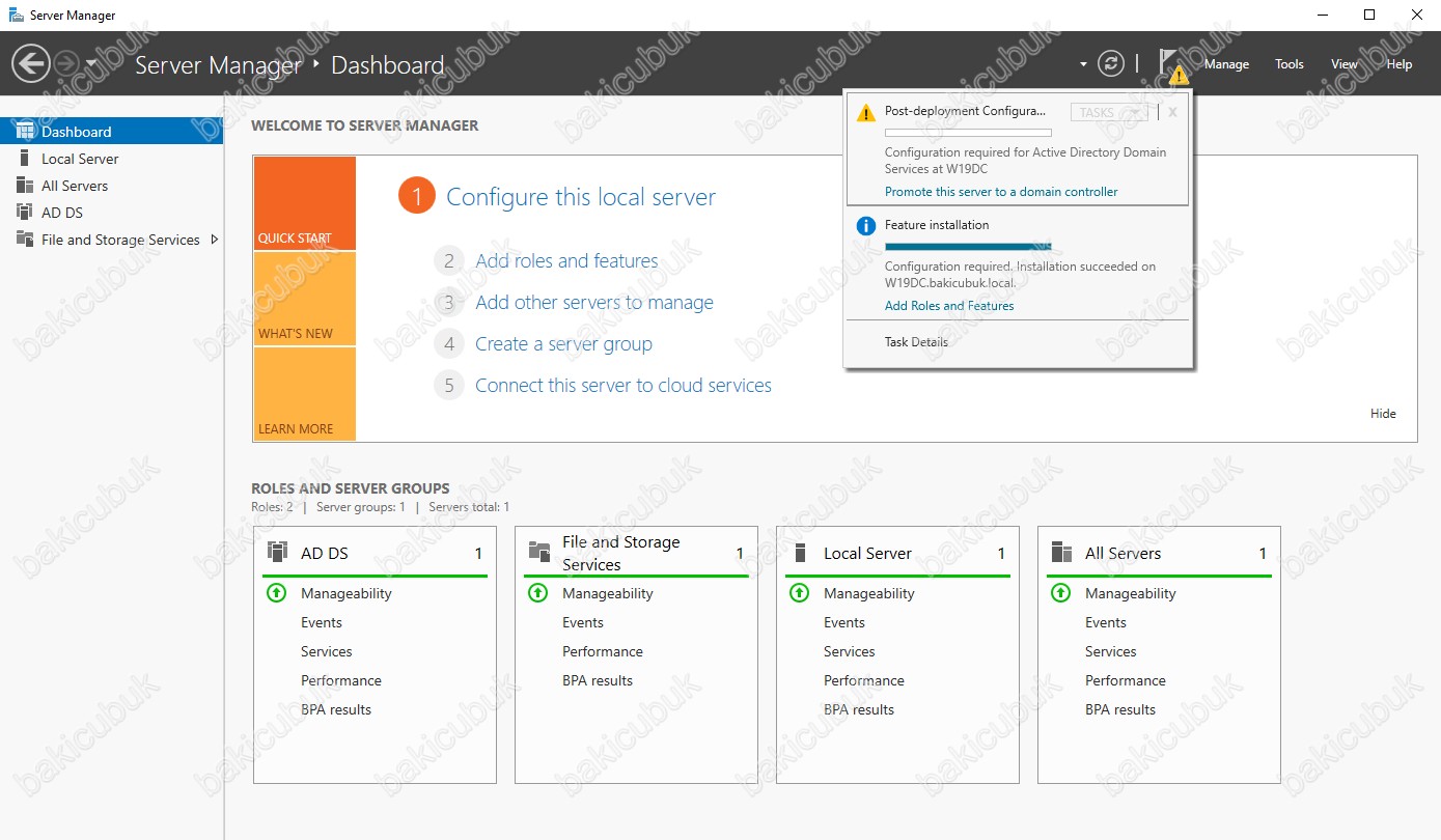 Server Manager üzerinde de Active Directory Domain Services rolünün kurulumunun yapıldığını ve Additional Domain Controller yapılandırılmasının gerektiğini görüyoruz.