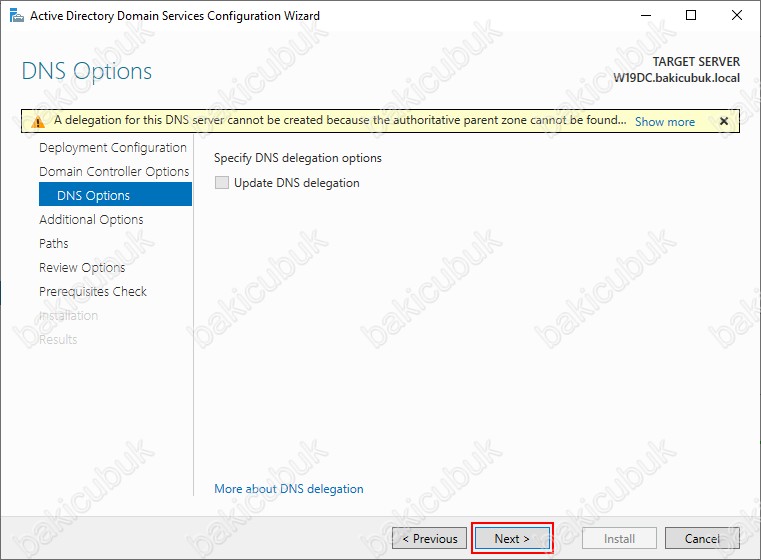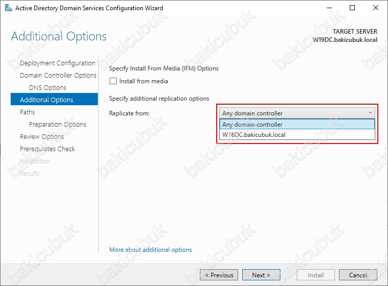 Replika From bölümünde eğer Any domain controller seçersek ortamda bulunan bütün Active Directory Domain Services sunucuları ile haberleşecektir ya da listeden hangi Active Directory Domain Services sunucusu ile haberleşmesini istiyorsak onu seçebiliriz. Additional Options ekranın da W16DC.bakicubuk.local seçerek Next diyerek devam ediyoruz.