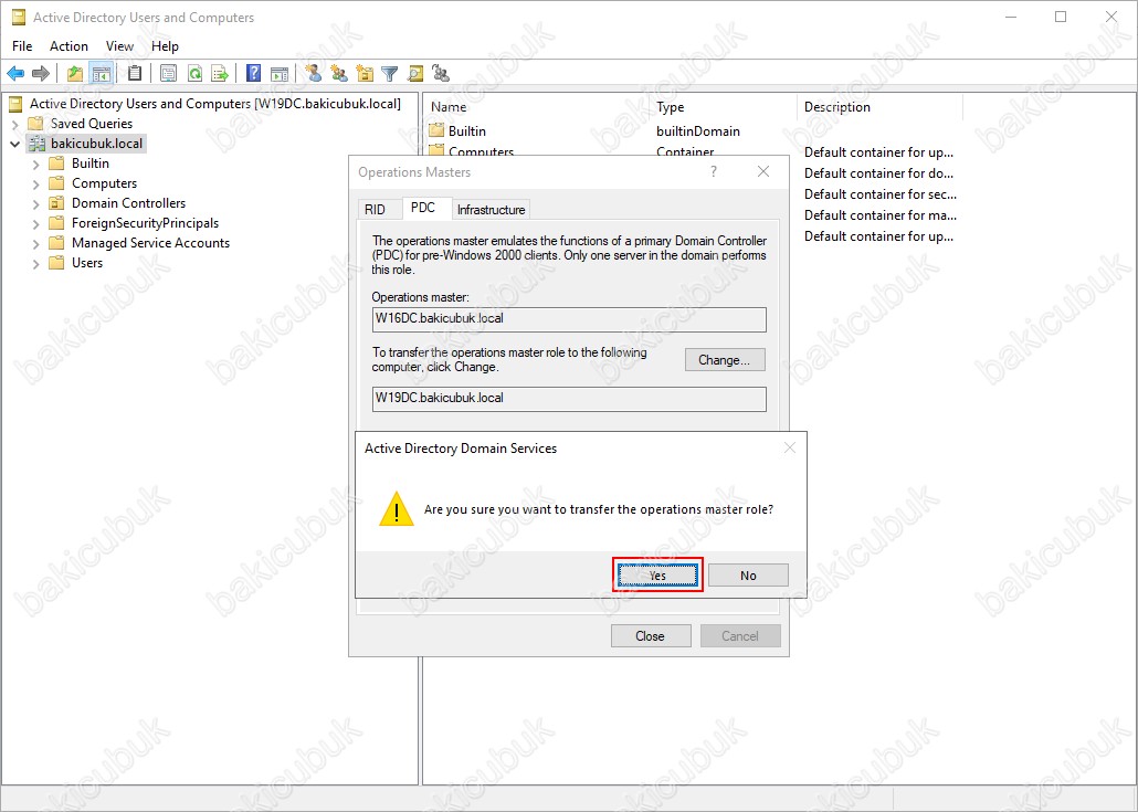 Operations Masters ekranın da PDC Emulator Flexible Single Master Operations ( FSMO ) rolünü Windows Server 2016 ( W16DC ) sunucumuz üzerinden Windows Server 2019 ( W19DC ) sunucumuz üzerine taşımak için karşımıza gelen uyarıda Yes diyoruz.