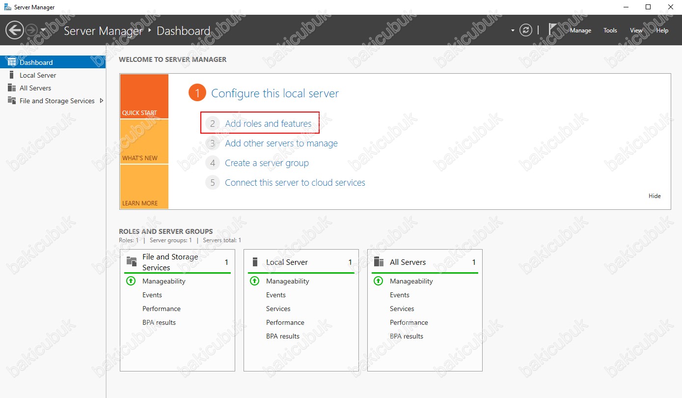 Additional Domain Controller olarak yapılandıracağımız sunucumuz üzerindeki gerekli yapılandırmayı tamamladıktan sonra Server Manager konsolunu açıyoruz. Dashboard ekranın da Add roles and Features tıklıyoruz. Dilerseniz sağ üst köşedeki Manage menüsünden Add Roles and Features ile rol ekleme sihirbazını açabiliriz.