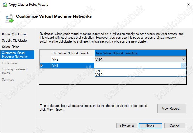 Customize Virtual Machine Networks ekranın da W16FOCLUSTER.bakicubuk.local isimli Hyper-V Failover Cluster yapısının da bulunan VN1 ve VN2 isimli Virtual Network yapılandırmasının W19FOCLUSTER.bakicubuk.local isimli Hyper-V Failover Cluster yapısın da bulunan VN-1 ve VN-2 isimli Virtual Network yapılandırmasında hangisi üzerine kopyalanacağını yapılandırdığımız ekrandır.