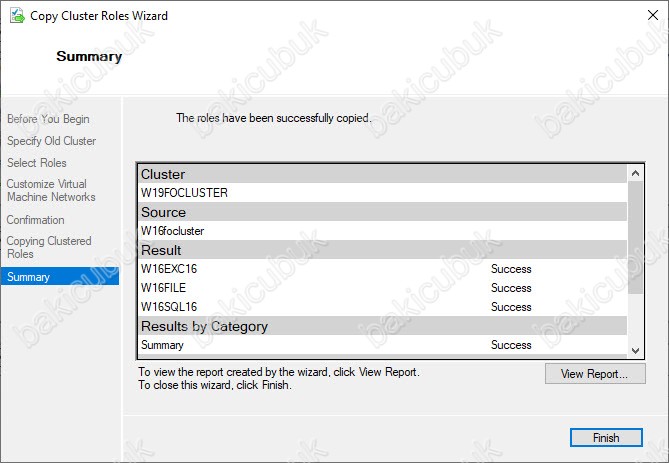 Summary ekranın da W19FOCLUSTER.bakicubuk.local isimli Hyper-V Failover Cluster yapısı üzerine W16FOCLUSTER.bakicubuk.local isimli Hyper-V Failover Cluster yapısın ve üzerinde çalışan W16EXC16, W16FILE ve W16SQL16 isimli Virtual Machine ( Sanal Makine ) sunucularımızın kopyalanacağını görüyoruz.
