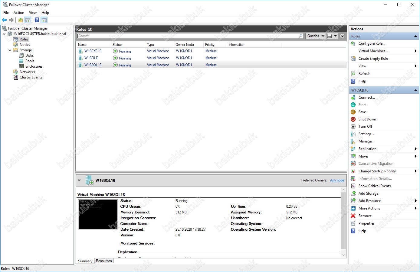 Failover Cluster Manager konsolunda Roles menüsü altında W16FOCLUSTER.bakicubuk.local isimli Hyper-V Failover Cluster yapısı üzerinde oluşturmuş olduğumuz W16EXC16, W16FILE ve W16SQL16 isimli Virtual Machine ( Sanal Makine ) sunucularımızı görüyoruz.