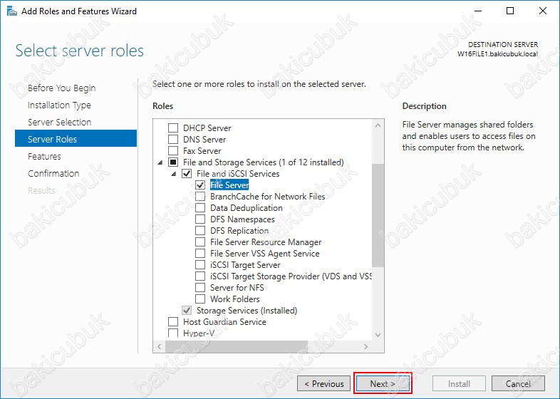 Select server roles ekraninda File Server rolünün kurulumunu gerçekleştireceğimiz için File Server rolünü işaretliyoruz.
