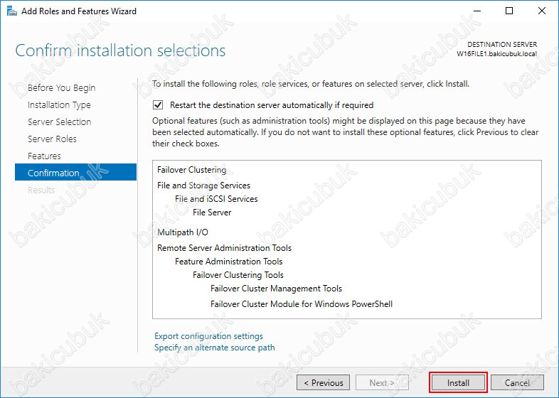 Confirm installation selections ekraninda Install diyerek File Server rolünün kuruluma başlatıyoruz. File Server rolünün kurulumu tamamlandiktan sonra sunucunun otomatik olarak restart etmek istersek eğer Restart the destination server automatically if required seçeneğini işaretlememiz gerekiyor.