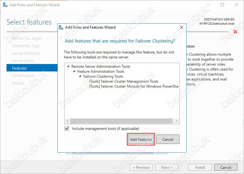 Failover Clustering özelliğini seçtiğimizde Add Roles and Features Wizard ekrani geliyor karşımıza Failover Clustering özelliği ile birlikte Remote Server Administration Tools özelliği içinde bulunan Failover Clustering Tools ve altinda bulunan Failover Clustering Module for Windows PowerShell; Failover Clustering Management Tools özelliklerinin kurulmasınu gerektiğini belirtiyor bizlere kurulumu devam etmek için Add Required Features diyerek Remote Server Administration Tools altinda bulunan bu özelliğinde kurulmasi sağlıyoruz.