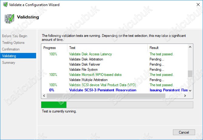 Validating ekraninda Failover Cluster yapımız için gerekli testlerin başladığını görüyoruz.
