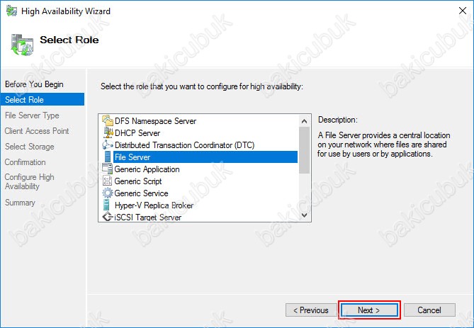 Select Role ekrani geliyor karşımıza bu ekranda High Availability ( Yüksek Erişebilirlik ) olarak yapılandıracağımız rolleri görüyoruz. Select Role ekrani File Server üzerinde High Availability ( Yüksek Erişebilirlik ) yapısını kuracağımız için File Server rolünü seçiyoruz ve Next diyerek devam ediyoruz.