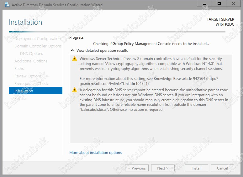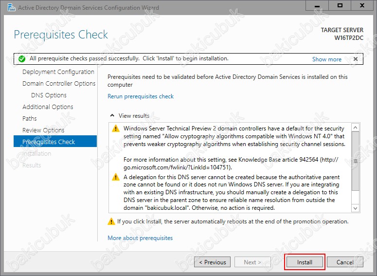 Prerequisities Check ekranın da Windows Server 2016 Technical Preview 2 Active Directory Domain Services rolü için check yaparak herhangi bir problem ya da eksiklik olup olmadiği kontrolünü yapacaktir.