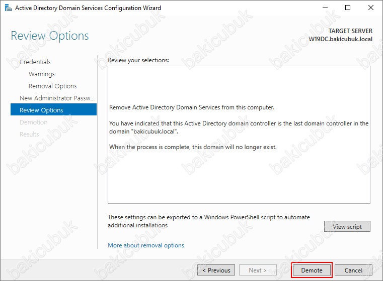 Review Options ekranın da daha önceki adımlarda Domain Controller yapılandırmasını kaldırmak için yapmış olduğumuz yapılandırmanın özetini görmekteyiz. Review Options ekranın da View Script bölümüne tıklayarak Additional Domain Controller kaldırmak için yapmış olduğumuz yapılandırmayı PowerShell komutu olarak alarak kaldırımı bu şekilde yapabiliriz.