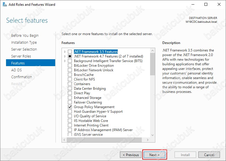 Select features ekranın da sunucumuz üzerine kurabileceğimiz Features ( Özellikler ) görüyoruz.
