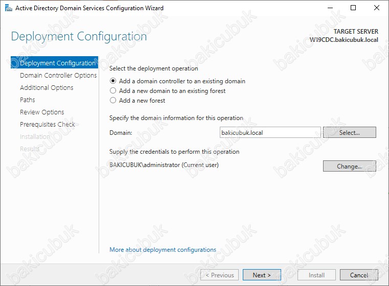 Deployment Configuration ekranın da Specify the domain information for this operation bölümü altında bulunan Parent domain name bölümünde bakicubuk.local isimli Active Directory Domain yapısını görüyoruz.