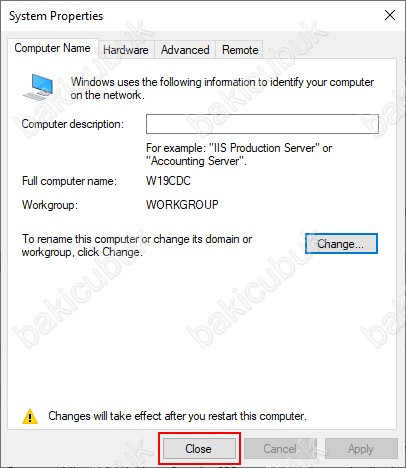 System Properties ekranın da Close diyerek sunucumuzun isminin yapılandırmasını tamamlıyoruz.