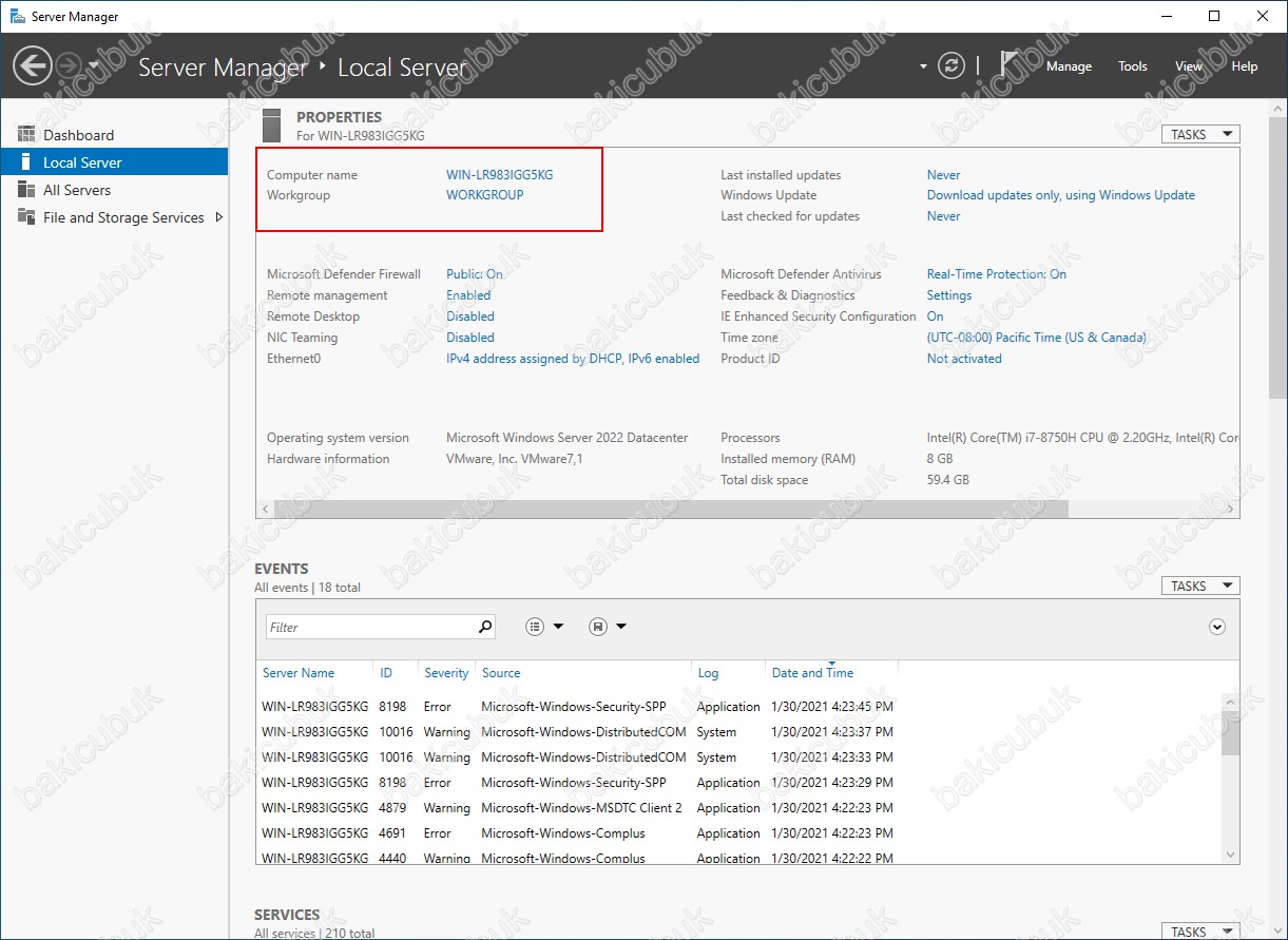Sunucumuz yeniden başladıktan sonra Server Manager konsolu üzerinde Computer name bölümünde sunucumuzun isminin yapılandırdığımız şekilde geldiğini görüyoruz.