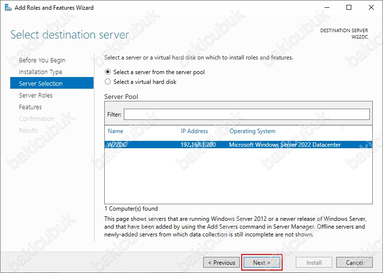 Select destination server ekranında kurulumu hangi sunucu üzerinde yapılacak ise o sunucuyu seçmemiz gerekiyor. Biz W22DC isimli sunucumuz üzerinde Active Directory Domain Services rolünü kurulumunu yaparak yapılandıracağımız için bu sunucumuzu seçiyoruz ve Next diyerek yapılandırmaya devam ediyoruz.