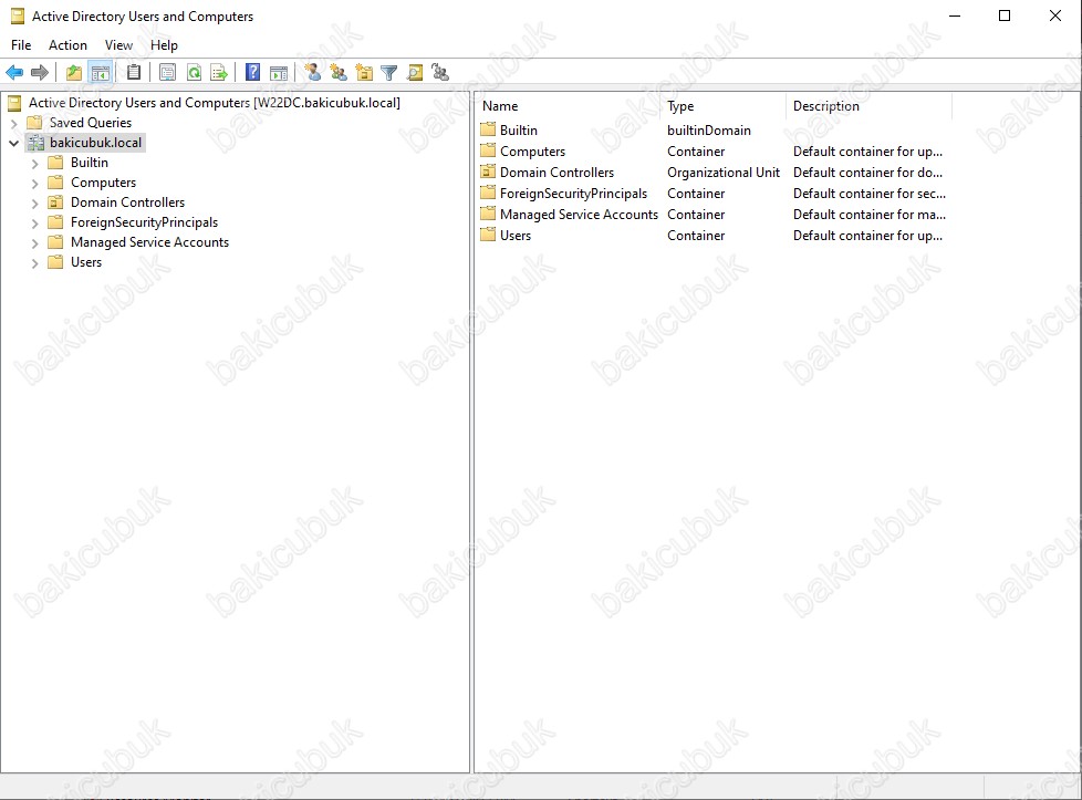 Active Directory Users and Computers konsolu aşağıda görüldüğü gibidir.