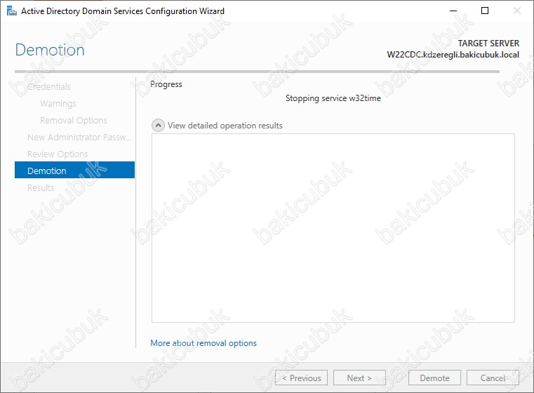 Demotion ekranın da W19CDC isimli sunucumuz üzerindeki Child Domain Controller yapılandırmasının kaldırma işleminin başladığını görüyoruz.