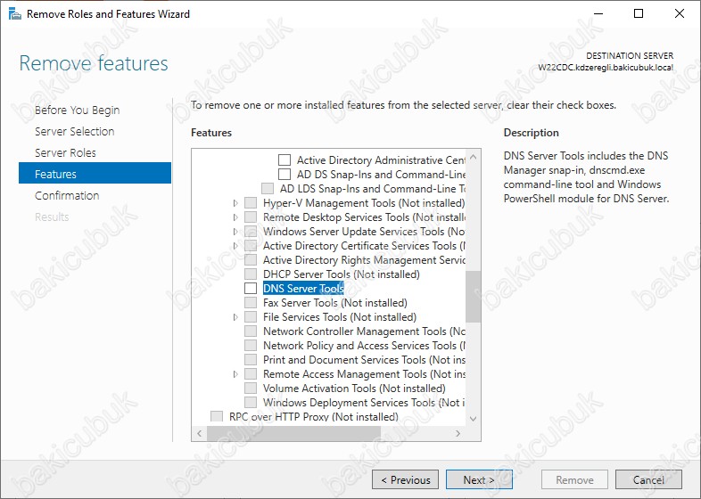 Remove features ekranın da Remote Administration Tools altında bulunan DNS Server Tools Features ( Özellik ) kaldırılmak için işaretinin kaldırıldığını görüyoruz.