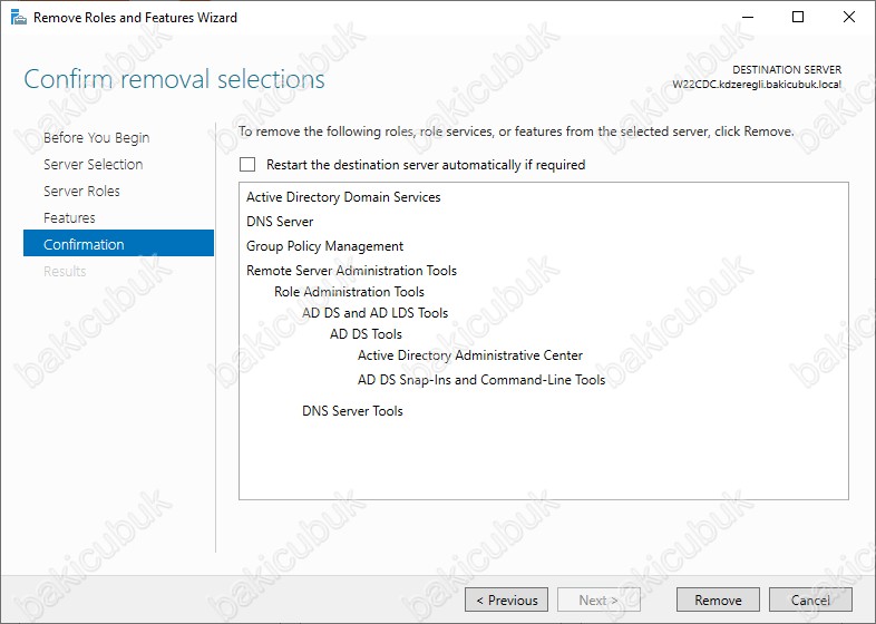 Remove features ekranın da Active Directory Domain Services rolü ile birlikte diğer özelliklerimiz olan Remote Administration Tools altında bulunan Active Directory Administrative Center ve AD DS Snap-Ins and Command Line Tools özelliklerinin kaldırılması için onay vermiştik.
