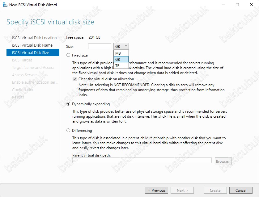 Specify iSCSI Virtual Disk Size ekranın da Virtual Disk ( Sanal Disk ) türleri için aşağıdak seçenekler bulunmaktadır.