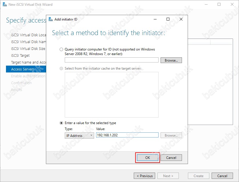 Select a method to identify the initiator ekranın da Enter a value for the select type seçeneğin de iSCSI Target Server üzerine erişim sağlayacak olan sunucularımızı için Type bölümünde IQN, DNS Name, IP Address ve MAC Adress gibi seçenekleri yapılandırarak sunucumuza erişim izini verebilirsiniz.