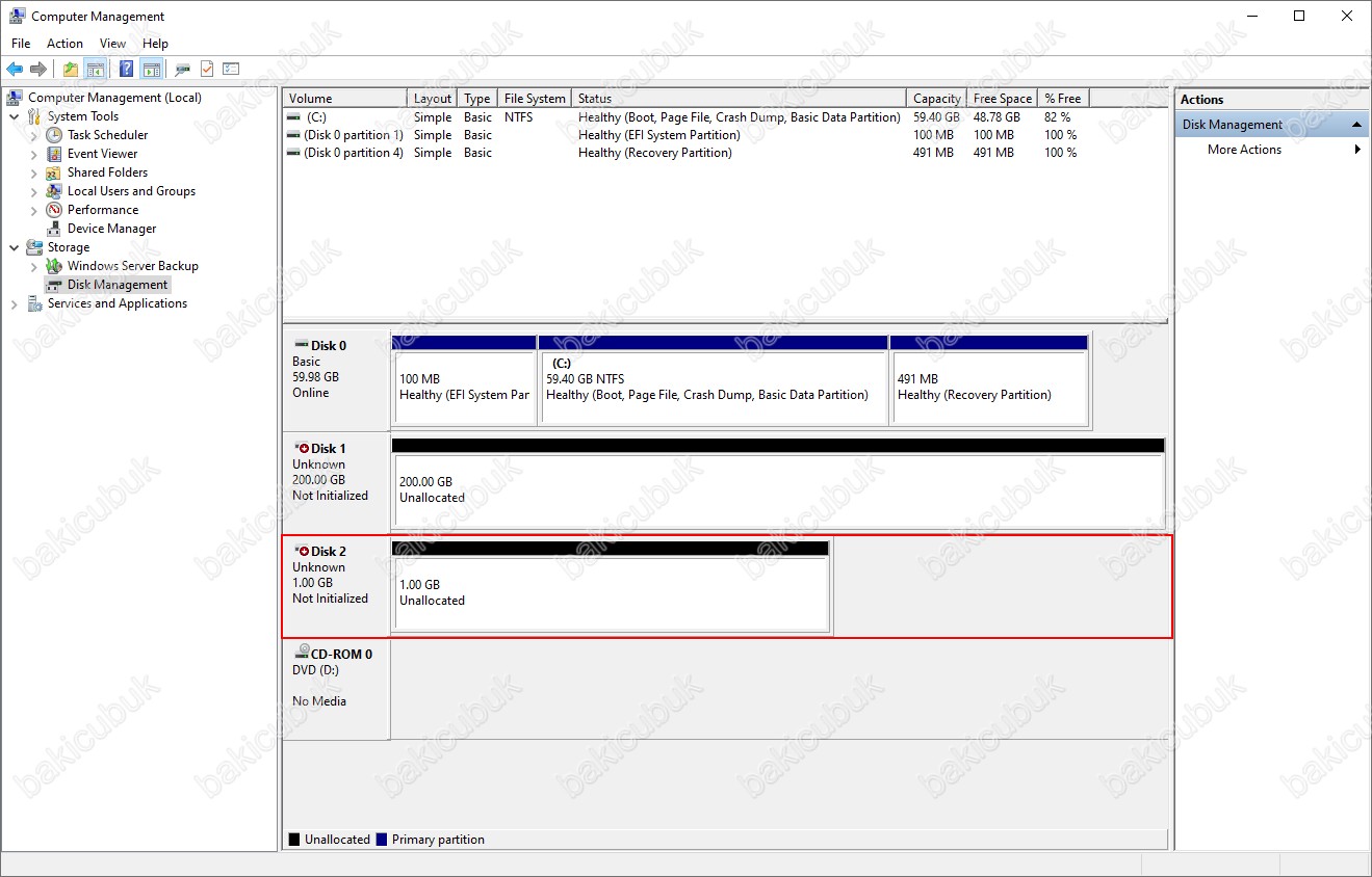 Disk Management ekranın da gördüğünüz gibi disklerimiz Offline ve Unknown olarak görülmektedir.
