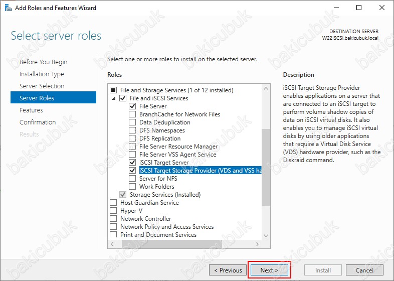 Select server roles ekranın da sunucumuz üzerinde File and Storage Services rolü altında bulunan iSCSI Target Storage Provider özelliğinide seçiyoruz.