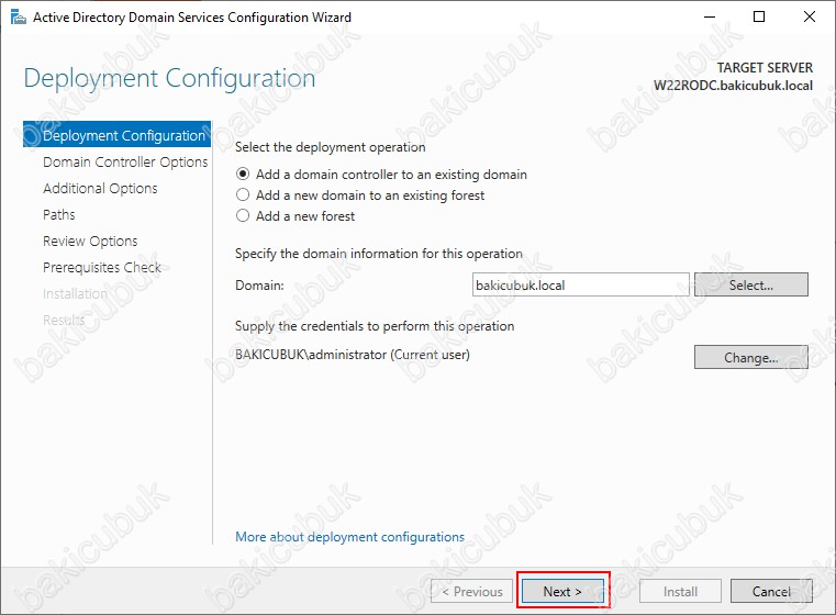 Biz mevcut ortamımız da bakicubuk.local isimli Active Directory Domain yapısı içerisinde Read Only Domain Controller yapılandıracağımız için ve sunucumuzu Active Directory Domain yapısına dahil ettiğimiz için Specify the domain information for this operation bölümü altında bulunan Domain bölümüne bakicubuk.local isimli Active Directory Domain yapısın geldiğini görüyoruz. Eğer sunumuzu Active Directory Domain yapısına dahil etmemiş olsaydık Specify the domain information for this operation bölümü altında bulunan Domain bölümü boş olarak görecektik.